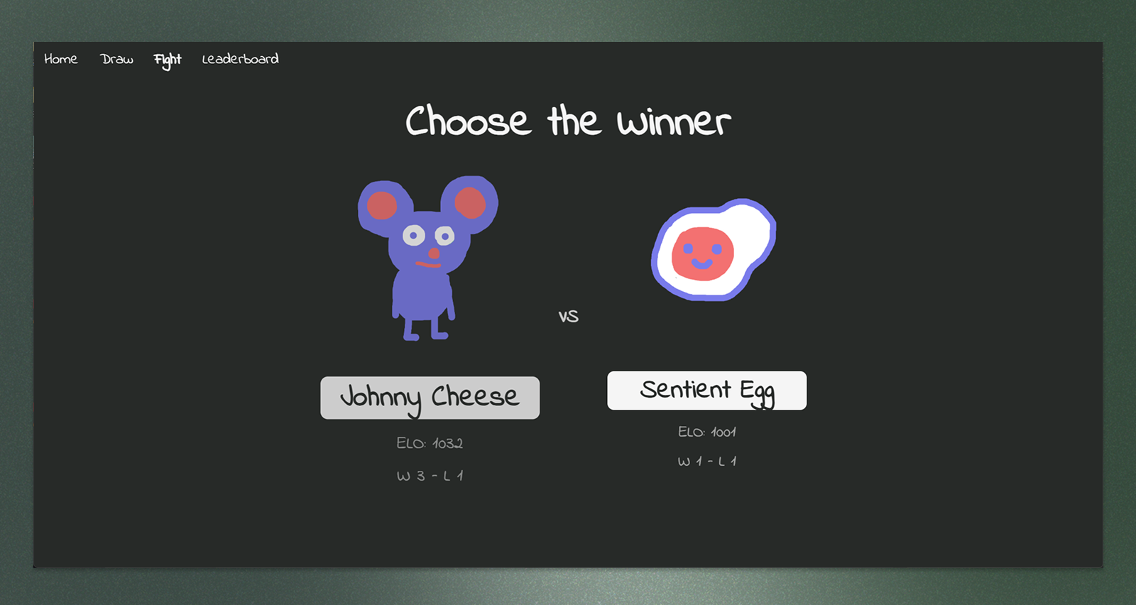 Once you've drawn your character, head to the Battle screen. Two drawings go head-to-head and you pick your favorite. Pretty straightforward, keeps the focus on the actual drawings.