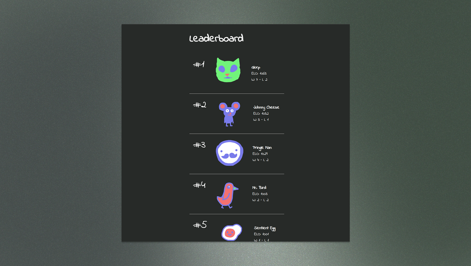 Votes get tracked and tallied into a leaderboard that ranks every character. It adds a little competitive layer to what is otherwise just a drawing app.